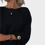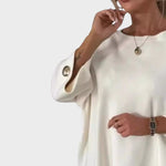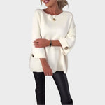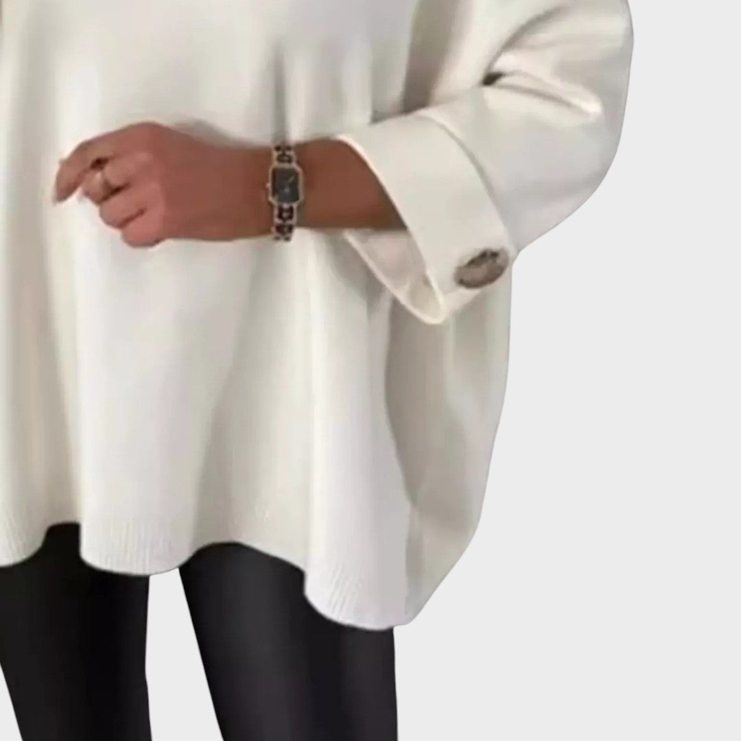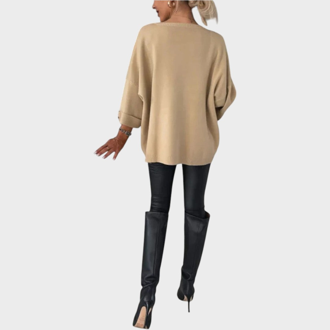Κομψό πλεκτό πουλόβερ με μοναδικό σχέδιο, φαρδιά μανίκια και διακοσμητικά κουμπιά . Το θηλυκό του κόψιμο με ελαφρώς πιο φαρδύ στρίφωμα το καθιστά ιδανικό για κάθε περίσταση, από κομψές εμφανίσεις μέχρι casual στυλ .