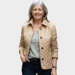 Αυτό το καπιτονέ μπουφάν διαθέτει μοτίβο ραφής με διαμάντια που του χαρίζει κλασική εμφάνιση και διακριτική υφή. Ο όρθιος γιακάς και το δομημένο κόψιμο προσδίδουν μια κομψή σιλουέτα, ενώ οι λεπτομέρειες με κουμπιά στο στρίφωμα και στην πλάτη στη μέση προσθέτουν μια πινελιά φινέτσας. Η ελαφριά κατασκευή του προσφέρει ζεστασιά χωρίς να γεμίζει όγκο, καθιστώντας το ιδανικό για layering σε πιο δροσερό καιρό.