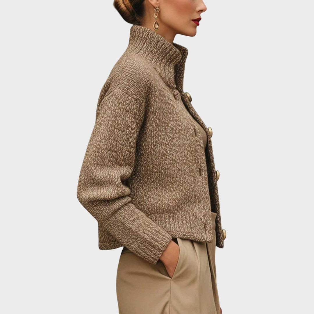 Το μπουφάν Violeta συνδυάζει τη δομή και την άνεση με τον πιο κομψό τρόπο. Ο σμιλεμένος γιακάς του, τα μεγάλα χρυσά κουμπιά και η κοντή σιλουέτα του δημιουργούν μια άμεσα κομψή εμφάνιση που μεταβαίνει αβίαστα από τις καθημερινές δραστηριότητες στις βραδινές εξόδους. Το ζεστό, αναπνεύσιμο ύφασμα και η χαλαρή, προσαρμοσμένη εφαρμογή του κάνουν αυτό το μπουφάν τόσο άνετο όσο και κομψό. Είτε φορεμένο πάνω από ένα πουλόβερ με ζιβάγκο, είτε σε συνδυασμό με ένα φαρδύ παντελόνι, είτε με το αγαπημένο σας τζιν, το Violeta φέρνει εκλεπτυσμένη κομψότητα σε κάθε εμφάνιση.