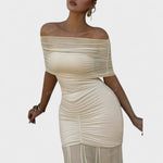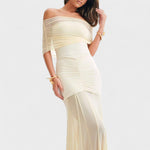 Αυτό το μακρύ πλεκτό φόρεμα είναι μια ωδή στον κομψό αισθησιασμό. Με μανίκια έξω από τους ώμους και εφαρμοστό κόψιμο, αγκαλιάζει τέλεια το σώμα, ενώ η διάφανη φούστα προσθέτει ρευστότητα και κομψότητα σε κάθε κίνηση. Είναι η ιδανική επιλογή για να ξεχωρίσετε σε ειδικές εκδηλώσεις με μια μοντέρνα και τολμηρή πινελιά.